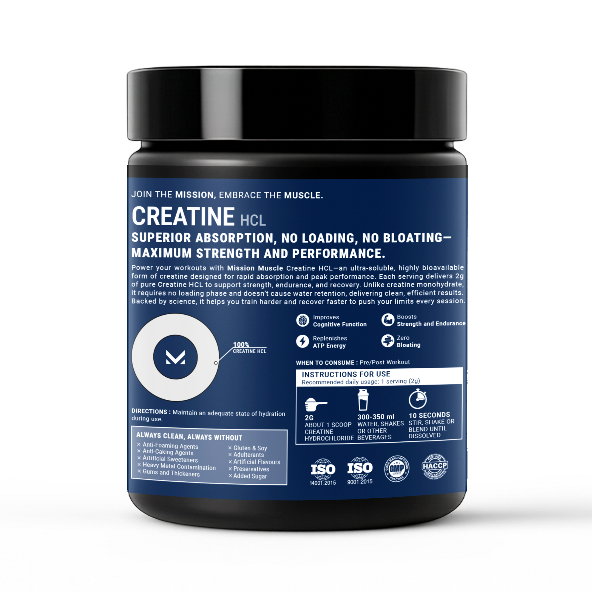 Experience next-level absorption, zero bloating, and superior performance with Mission Muscle Creatine HCl, a highly soluble and concentrated form of creatine designed for serious athletes. Perfect for lean gains, explosive strength, and faster recovery—without the water retention of regular creatine.