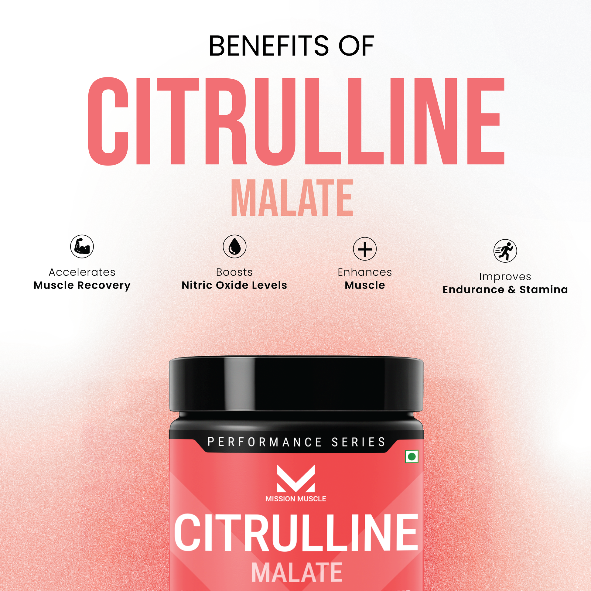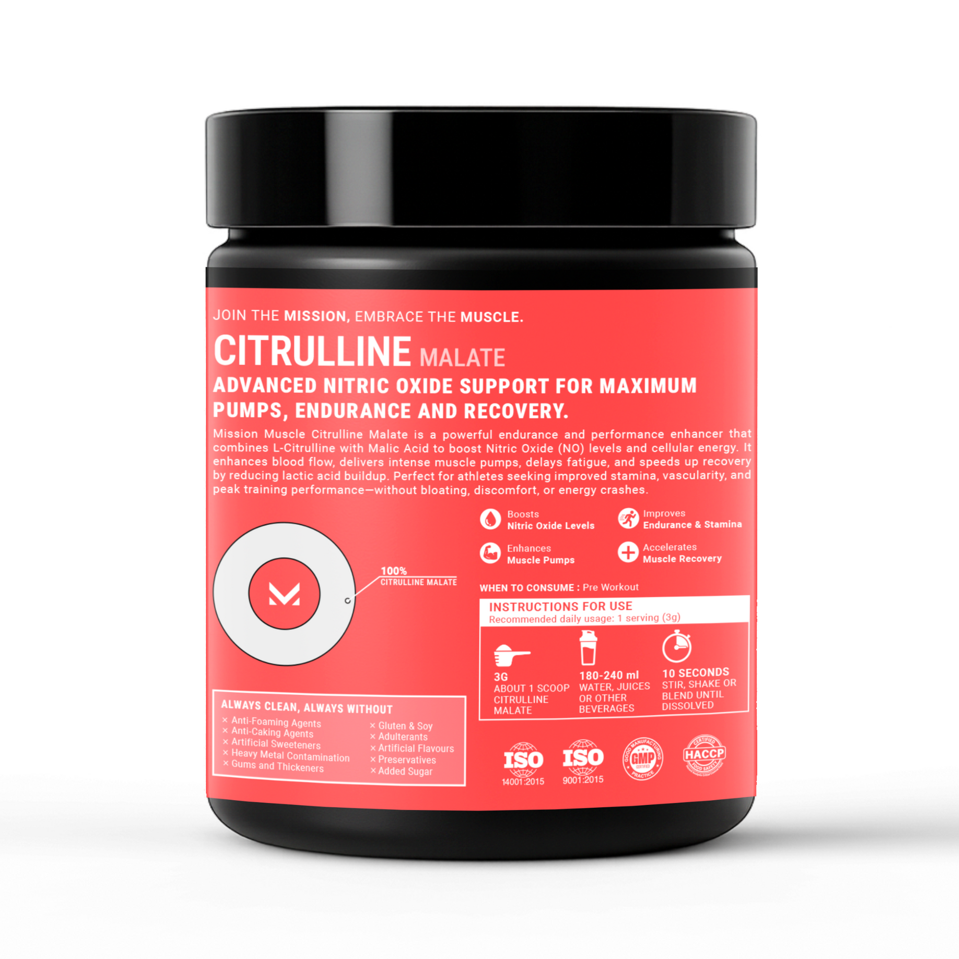 Unlock your peak performance with Mission Muscle Citrulline Malate — your ultimate ally for greater stamina, muscle pumps, and faster recovery.